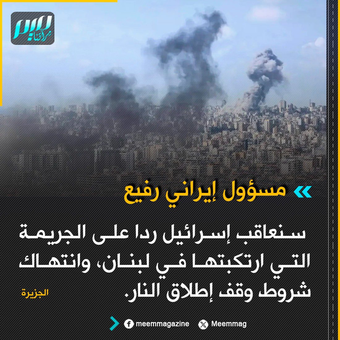 مسؤول إيراني رفيع لـ"الجزيرة": سنعاقب إسرائيل ردا على الجريمة التي ارتكبتها في لبنان، وانتهاك شروط وقف إطلاق النار