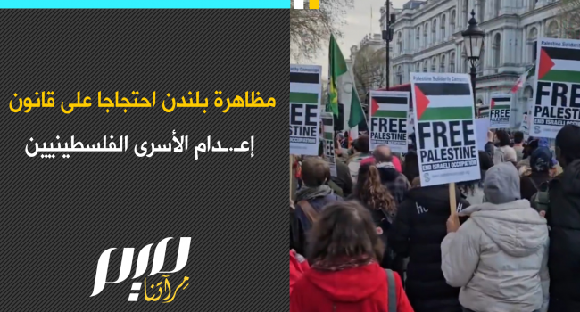 الآلاف يتظاهرون في العاصمة البريطانية لندن احتجاجا على إقرار كنيست الكيان لقانون إعـ.ـدام الأسرى الفلسطينيين.