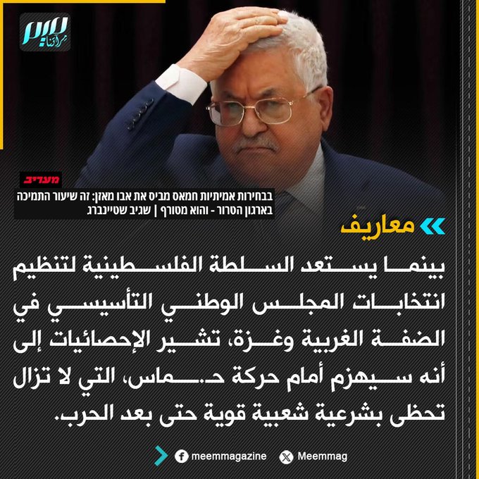 معاريف: بينما يستعد السلطة الفلسطينية لتنظيم انتخابات المجلس الوطني التأسيسي في الضفة الغربية وغزة، تشير الإحصائيات إلى أنه سيهزم أمام حركة حـ.ـماس، التي لا تزال تحظى بشرعية شعبية قوية حتى بعد الحرب.