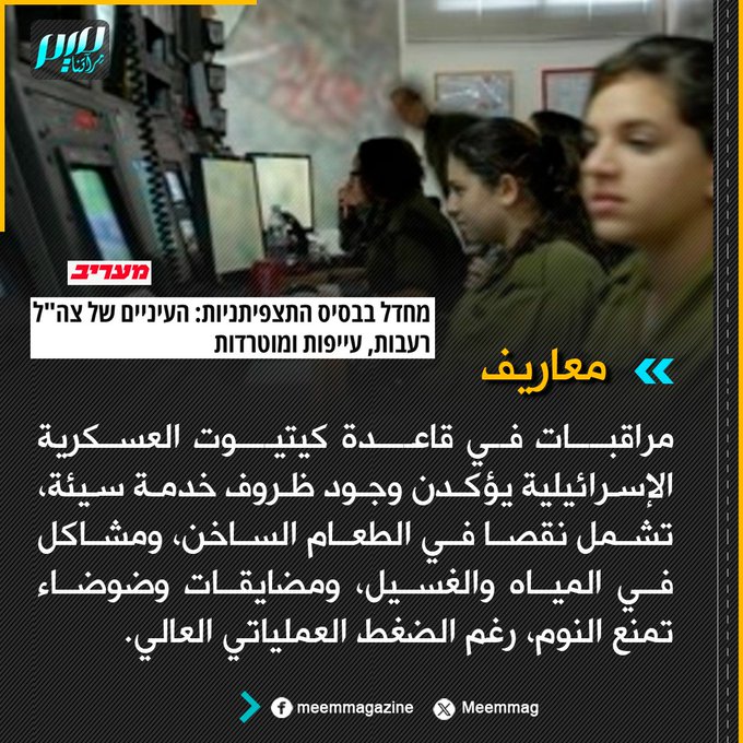 معاريف: مراقبات في قاعدة كيتيوت العسكرية الإسرائيلية يؤكدن وجود ظروف خدمة سيئة، تشمل نقصا في الطعام الساخن، ومشاكل في المياه والغسيل، ومضايقات وضوضاء تمنع النوم، رغم الضغط العملياتي العالي.
