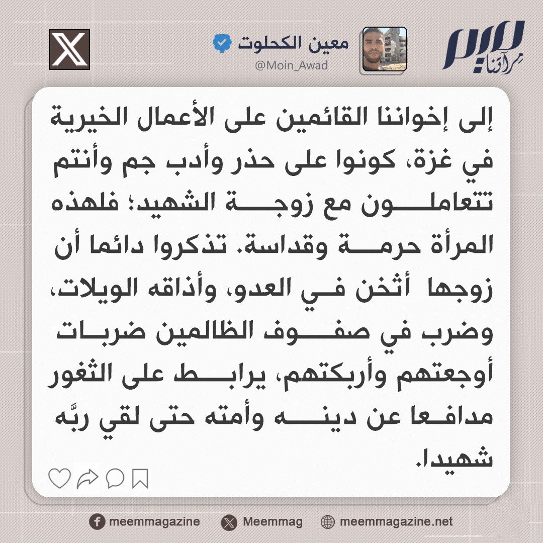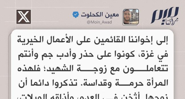 معين الكحلوت: إلى إخواننا القائمين على الأعمال الخيرية في غزة، كونوا على حذر وأدب جم وأنتم تتعاملون مع زوجة الشهـ ـيد؛ فلهذه المرأة حرمة وقداسة.