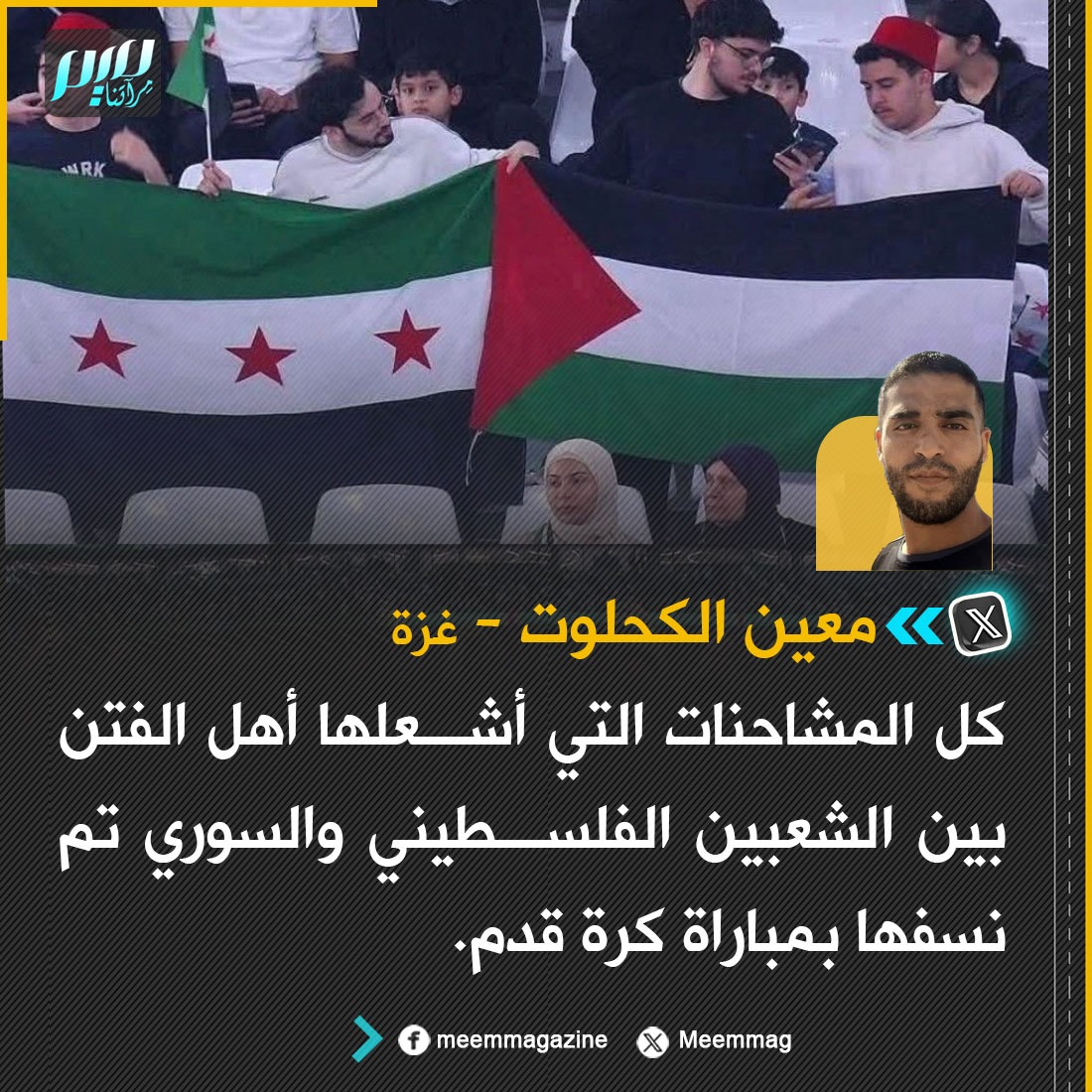 معين الكحلوت: كل المشاحنات التي أشعلها أهل الفتن بين الشعبين الفلسطيني والسوري تم نسفها بمباراة كرة قدم.