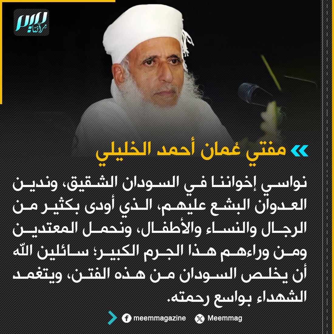 مفتي عُمان: نواسي إخواننا في السودان الشقيق، وندين العدوان البشع عليهم، الذي أودى بكثير من الرجال والنساء والأطفال، ونحمل المعتدين ومن وراءهم هذا الجرم الكبير؛ سائلين الله أن يخلص السودان من هذه الفتن، ويتغمد الشهداء بواسع رحمته.