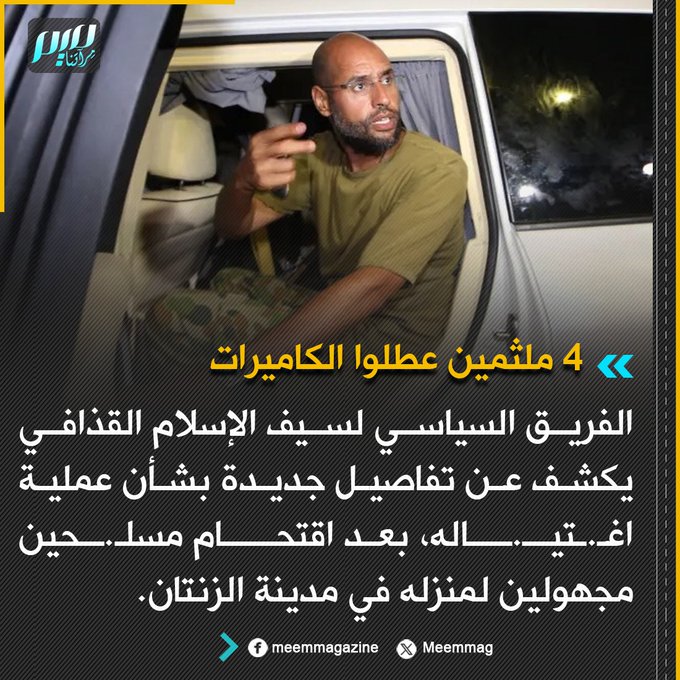 4 ملثمين عطلوا الكاميرات.. الفريق السياسي لسيف الإسلام القذافي يكشف عن تفاصيل جديدة بشأن عملية اغتـ.ـياله، بعد اقتحام مسلحين مجهولين لمنزله في مدينة الزنتان.