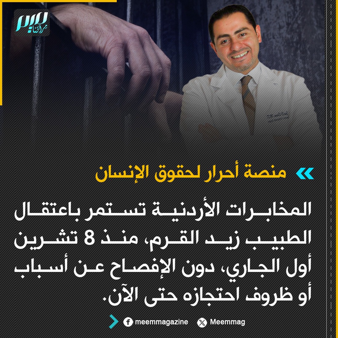 منصة أحرار لحقوق الإنسان: المخابرات الأردنية تستمر باعتقال الطبيب زيد القرم