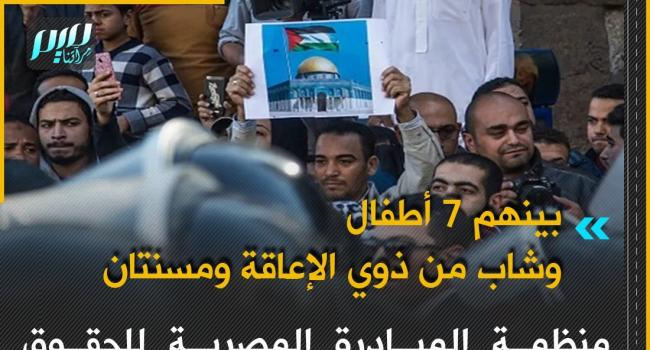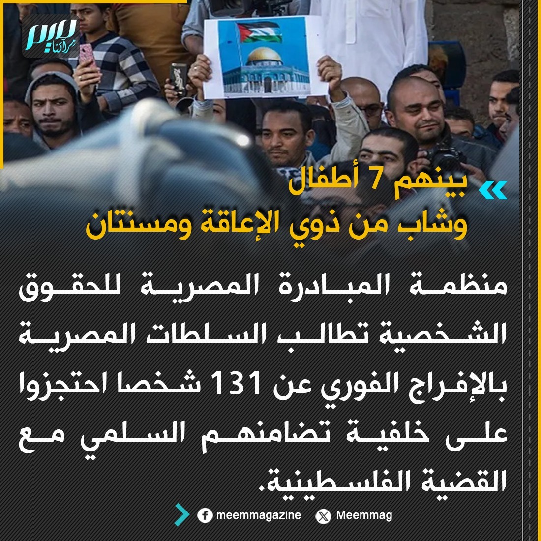 بينهم 7 أطفال وشاب من ذوي الإعاقة وسيدتان مسنتان.. منظمة المبادرة المصرية للحقوق الشخصية تطالب السلطات المصرية بالإفراج الفوري عن 131 مواطنا احتجزوا على خلفية تضامنهم السلمي مع الفضية الفلسطينية.