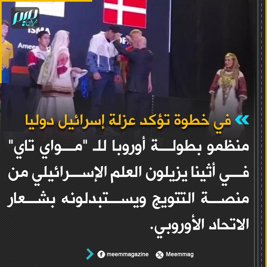 منظمو بطولة أوروبا للـ "مواي تاي" في أثينا يزيلون العلم الإسرائيلي من منصة التتويج ويستبدلونه بشعار الاتحاد الأوروبي.