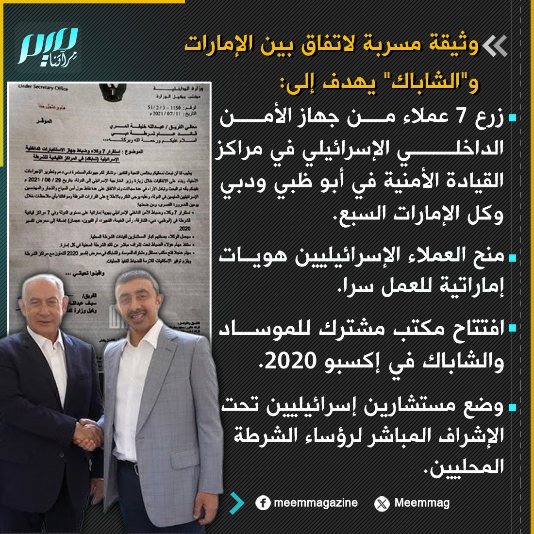 من بين خططها "زرع 7 عملاء من "الشاباك" الإسرائيلي في مراكز قيادة الأمن الإماراتي ومنحهم هويات إماراتية للعمل سرا".. تسريب وثيقة سرية تفضح اتفاقا يعود إلى عام 2021 بين وزارة الداخلية الإماراتية وجهاز الأمن الداخلي الإسرائيلي.