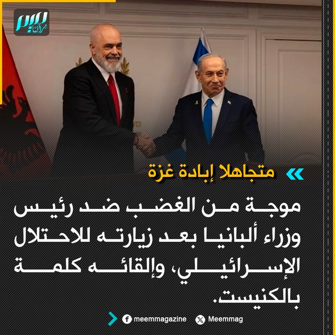 وصف نتنياهو بأحد أفضل خمسة خطباء بالعالم.. موجة من الغضب ضد رئيس وزراء ألبانيا بعد زيارته للاحتلال الإسرائيلي، وإلقائه كلمة بالكنيست جاء فيها: "زوجتي مسلمة، وأنا كاثوليكي، وأطفالي الكبار مسيحيون أرثوذكس، أما أصغرهم فسيقرر بنفسه مستقبلا، وليس مستبعدا أن يختار اليهودية".