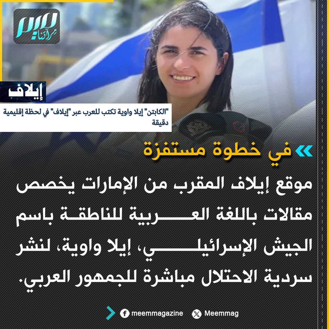 في خطوة مستفزة.. موقع إيلاف المقرب من الإمارات يخصص مقالات باللغة العربية للناطقة باسم الجيش الإسرائيلي، إيلا واوية، لنشر سردية الاحتلال مباشرة للجمهور العربي.