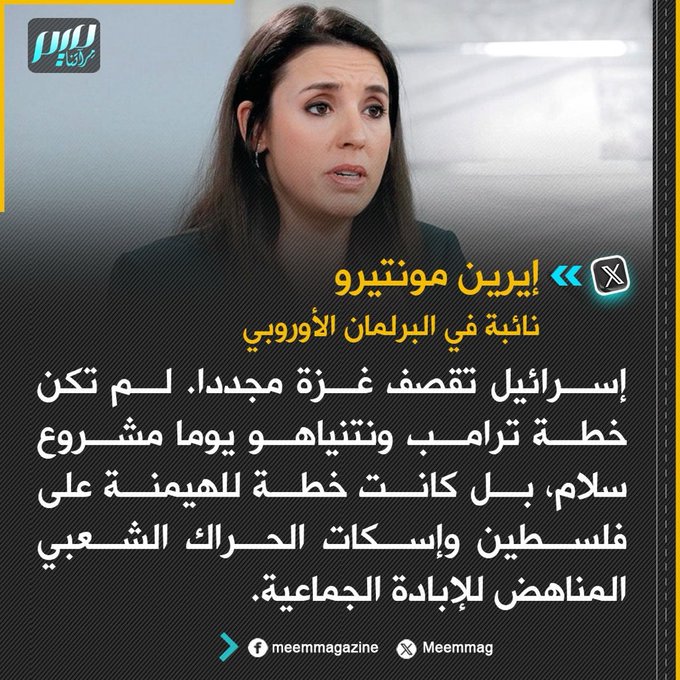 نائبة في البرلمان الأوروبي: إسرائيل تقصف غزة مجددا. لم تكن خطة ترامب ونتنياهو يوما مشروع سلام، بل كانت خطة للهيمنة على فلسطين وإسكات الحراك الشعبي المناهض للإبادة الجماعية.