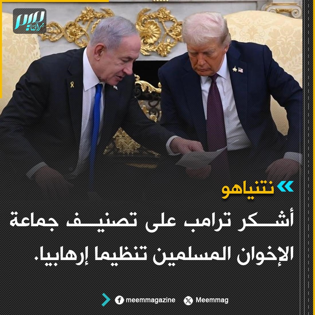 نتنياهو: أشكر ترامب على تصنيف جماعة الإخوان المسلمين تنظيما إرهابيا.