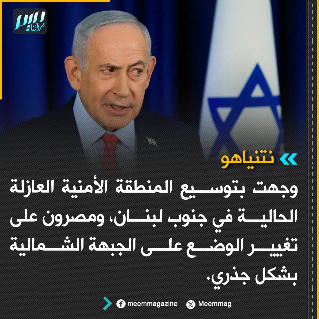 رئيس الوزراء الإسرائيلي بنيامين نتنياهو: وجهت بتوسيع المنطقة الأمنية العازلة الحالية في جنوب لبنان، ومصرون على تغيير الوضع على الجبهة الشمالية بشكل جذري.
