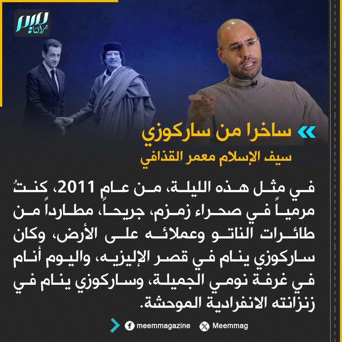 نجل معمر القذافي: في مثل هذه الليلة، من عام 2011، كنتُ مرمياً في صحراء زمزم، جريحاً، مطارداً من طائرات الناتو وعملائه على الأرض، وكان ساركوزي ينام في قصر الإليزيه، واليوم أنام في غرفة نومي الجميلة، وساركوزي ينام في زنزانته الانفرادية الموحشة، وقد اشتغلت 14 عاماً حتى وصلت إلى هذه النتيجة.
