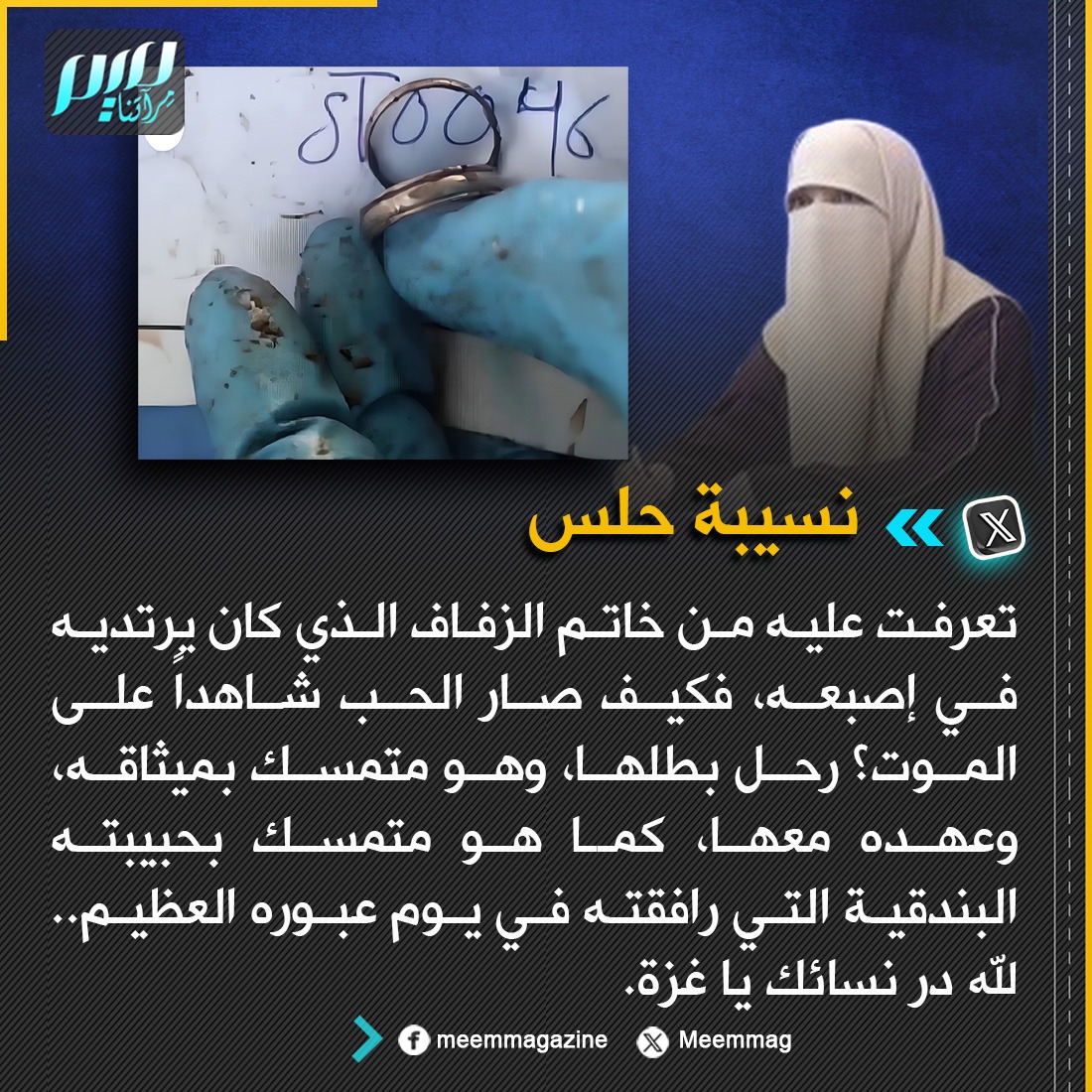 نسيبة حلس: تعرفت عليه من خاتم الزفاف الذي كان يرتديه في إصبعه، فكيف صار الحب شاهداً على الموت؟ رحل بطلها، وهو متمسك بميثاقه، وعهده معها، كما هو متمسك بحبيبته البندقية التي رافقته في يوم عبوره العظيم.. لله در نسائك يا غزة.