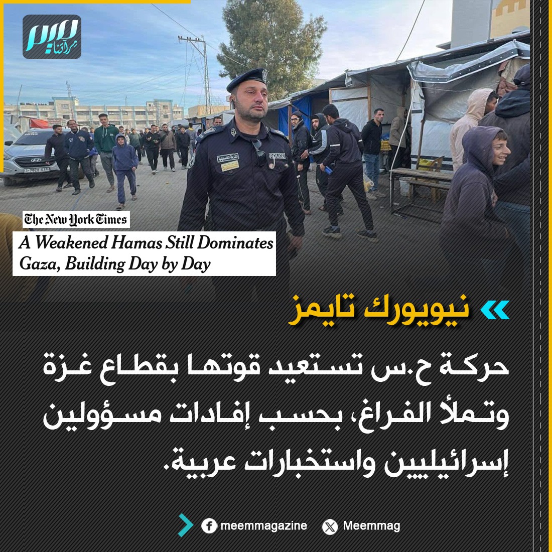 نيويورك تايمز: حركة ح.س تستعيد قوتها بقطاع غزة وتملأ الفراغ، بحسب إفادات مسؤولين إسرائيليين واستخبارات عربية.