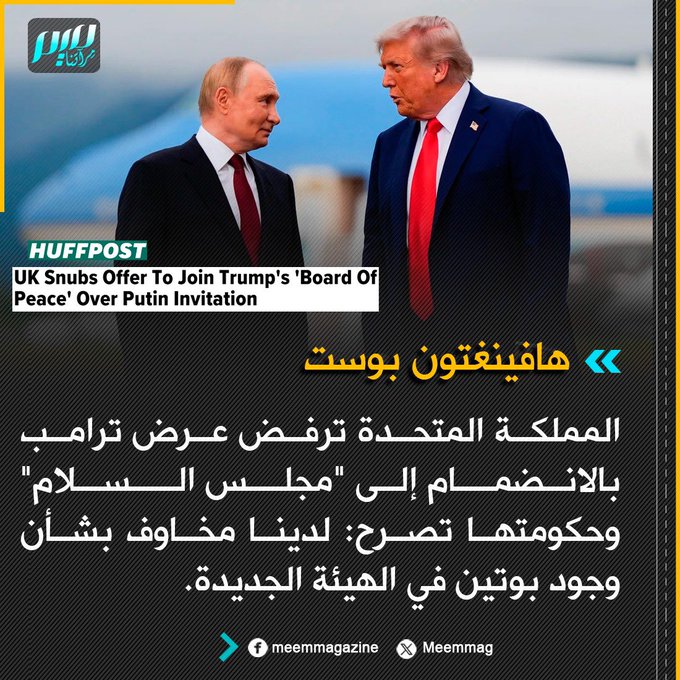 هافينغتون بوست: المملكة المتحدة ترفض عرض ترامب بالانضمام إلى "مجلس السلام" وحكومتها تصرح: لدينا مخاوف بشأن وجود بوتين في الهيئة الجديدة.