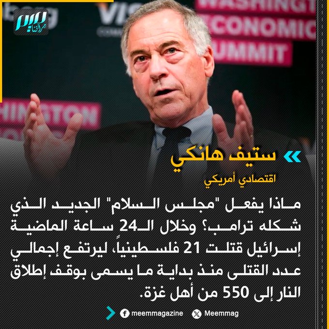 هانكي: ماذا يفعل "مجلس السلام" الجديد الذي شكله ترامب؟ وخلال الـ24 ساعة الماضية إسرائيل قتلت 21 فلسطينياً، ليرتفع إجمالي عدد القتلى منذ بداية ما يسمى بوقف إطلاق النار إلى 550 من أهل غزة.