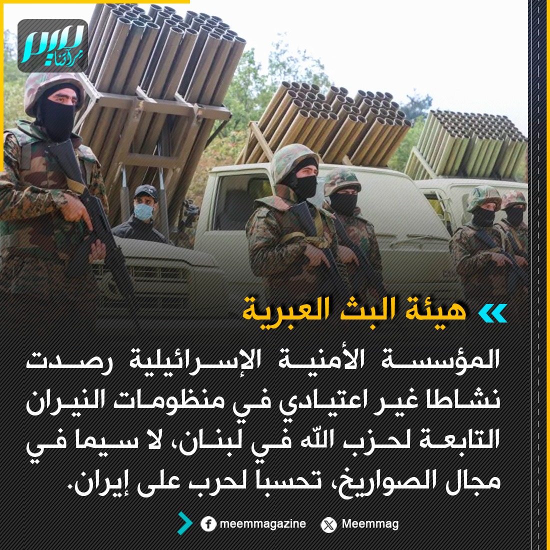 هيئة البث العبرية: المؤسسة الأمنية الإسرائيلية رصدت نشاطا غير اعتيادي في منظومات النيران التابعة لحزب الله في لبنان، لا سيما في مجال الصواريخ، تحسبا لحرب على إيران.