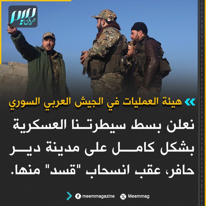 هيئة العمليات في الجيش العربي السوري: نعلن بسط سيطرتنا العسكرية بشكل كامل على مدينة دير حافر