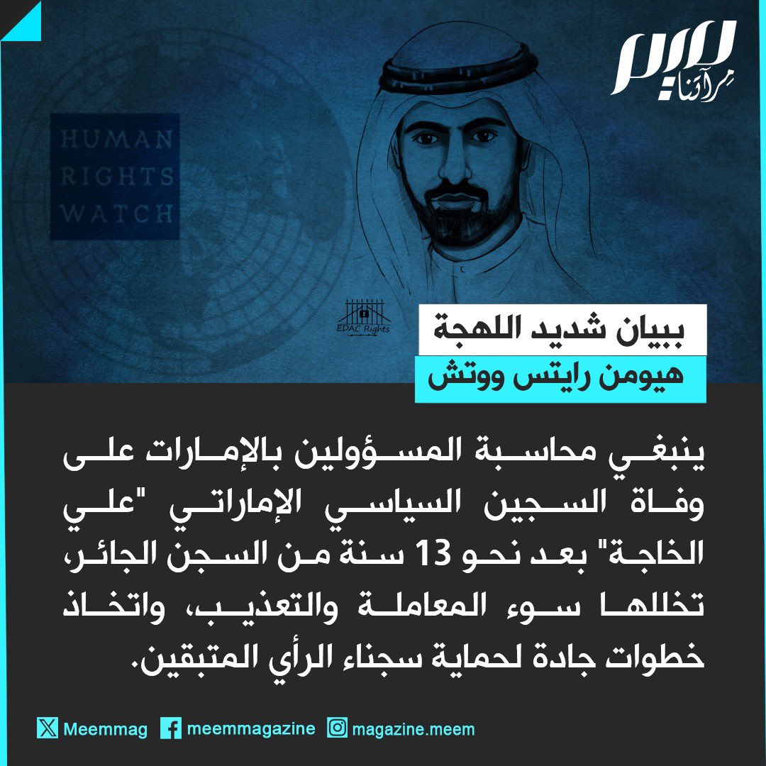 هيومن رايتس: ينبغي محاسبة المسؤولين بالإمارات على وفاة السجين السياسي الإماراتي "علي الخاجة" بعد نحو 13 سنة من السجن الجائر، تخللها سوء المعاملة والتعذيب، واتخاذ خطوات جادة لحماية سجناء الرأي المتبقين.