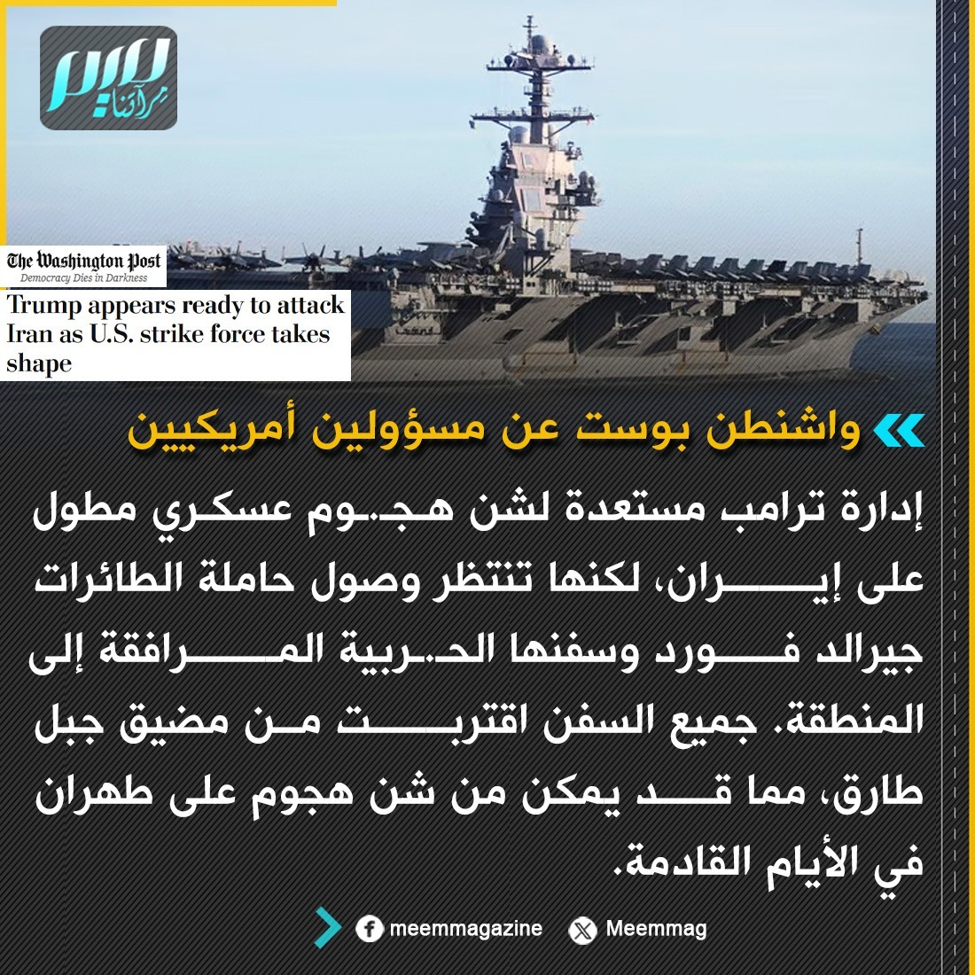 واشنطن بوست: إدارة ترامب مستعدة لشن هـجـ.ـوم عسكري مطول على إيران، لكنها تنتظر وصول حاملة الطائرات جيرالد فورد وسفنها الحـ.ـربية المرافقة إلى المنطقة.