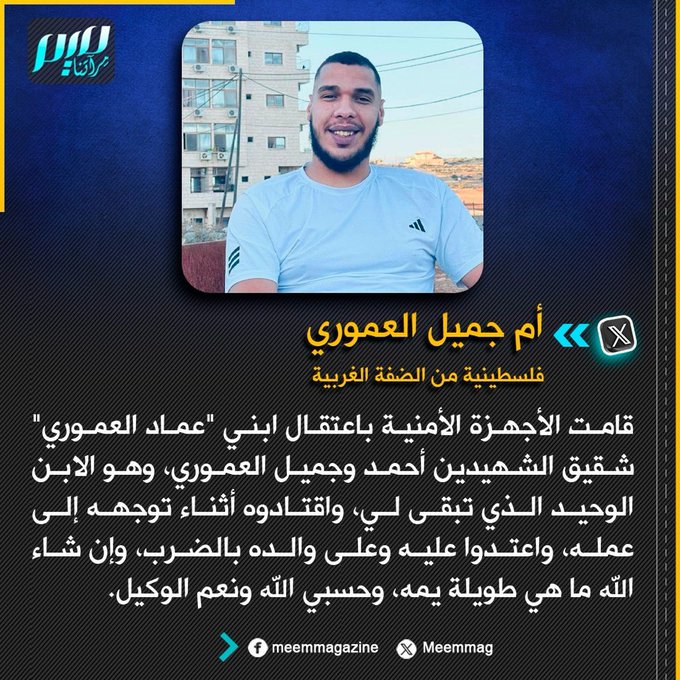 والدة شهيدين بالضفة الغربية تعبر عن أساها لاعتقال أجهزة السلطة الفلسطينية وحيدها "عماد العموري" والاعتداء بالضرب عليه وعلى والده.