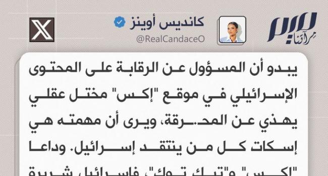 الإعلامية الأمريكية كانديس أوينز تعليقا على الرقابة الإسرائيلية على الانترنت: وداعا "إكس" و"تيك توك"، فإسرائيل شريـ ـرة لدرجة أنها تحتاج إلى رقابة جماعية، لأن أي إنسان عاقل يعرف حقيقة تاريخها سيقف ضدها.