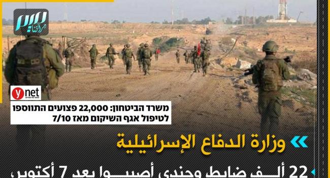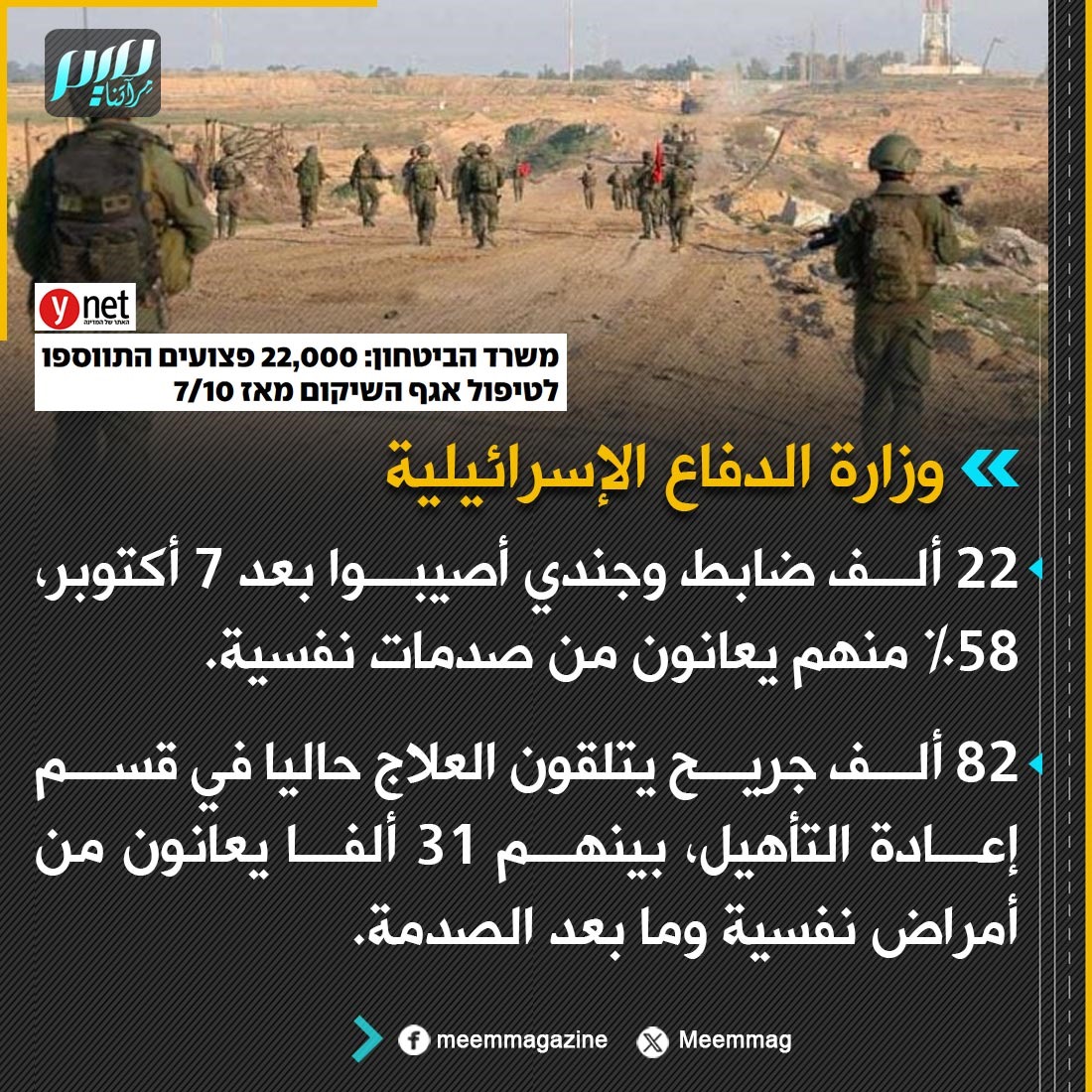 وزارة الدفاع الإسرائيلية: 22 ألف ضابط وجندي أصيبوا بعد 7 أكتوبر، 58% منهم يعانون من صدمات نفسية.