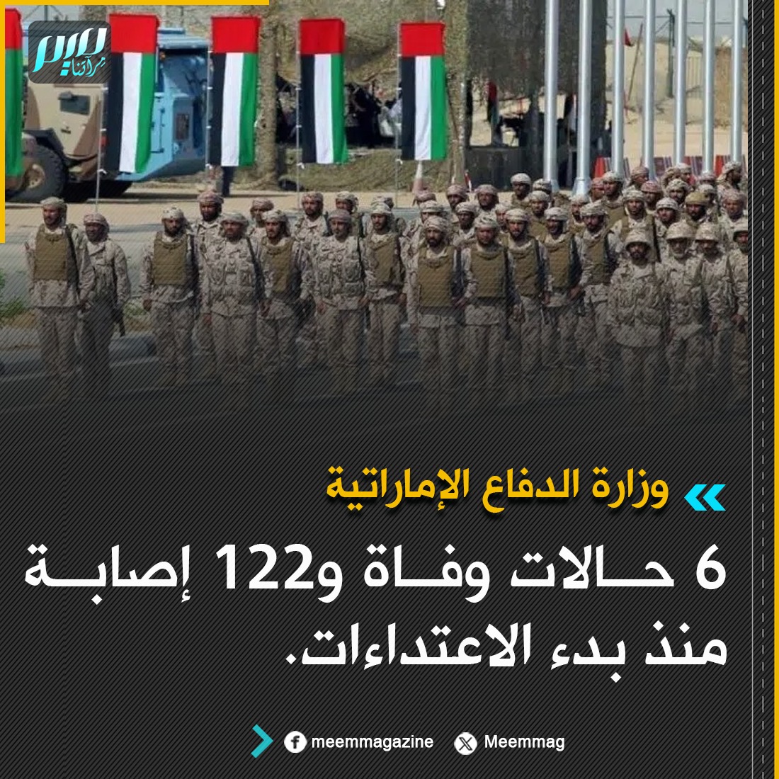 وزارة الدفاع الإماراتية: ٦ حالات وفاة و١٢٢ إصابة منذ بدء الاعتداءات.