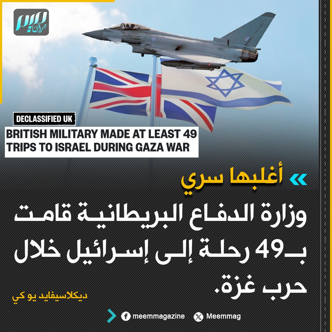 موقع الصحافة الاستقصائية البريطاني "ديكلاسيفايد يو كي": وزارة الدفاع في المملكة المتحدة قامت بـ49 رحلة إلى إسرائيل خلال حرب غزة، أغلبها سري.