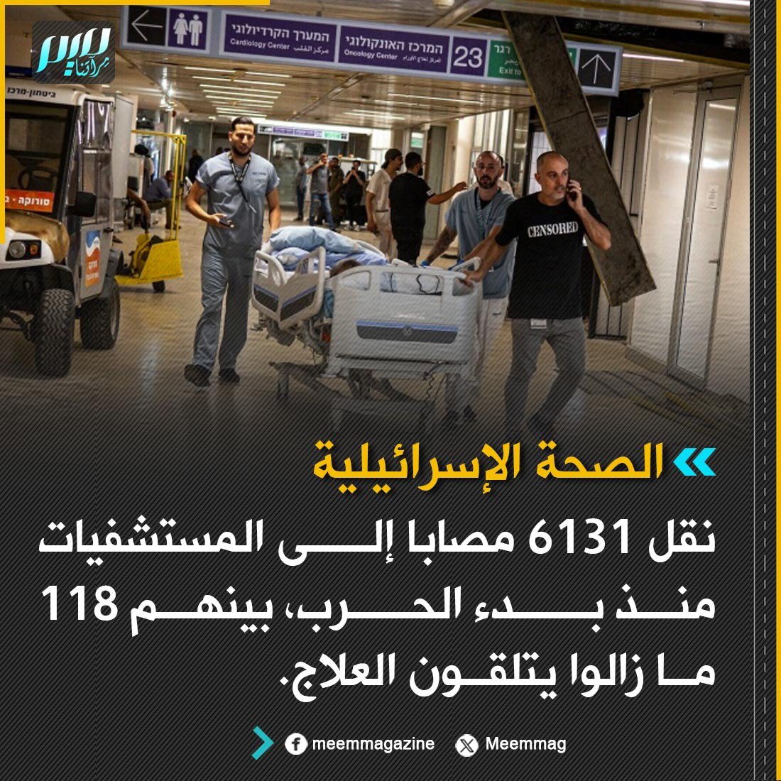 وزارة الصحة الإسرائيلية: نقل 6131 مصابا إلى المستشفيات منذ بدء الحرب، بينهم 118 ما زالوا يتلقون العلاج.