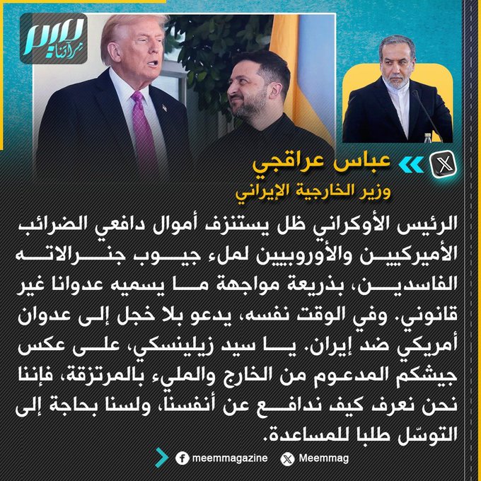 وزير الخارجية الإيراني ردا على دعوة زيلنسكي للعدوان على طهران: على عكس جيشكم المدعوم خارجيا والمليء بالمرتزقة، فإننا نحن نعرف كيف ندافع عن أنفسنا.