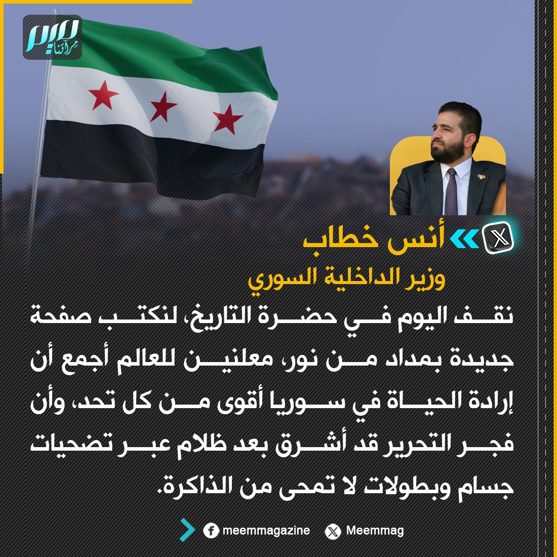 وزير الداخلية السوري: نقف اليوم في حضرة التاريخ، لنكتب صفحة جديدة بمداد من نور، معلنين للعالم أجمع أن إرادة الحياة في سوريا أقوى من كل تحد، وأن فجر التحرير قد أشرق بعد ظلام عبر تضحيات جسام وبطولات لا تمحى من الذاكرة.