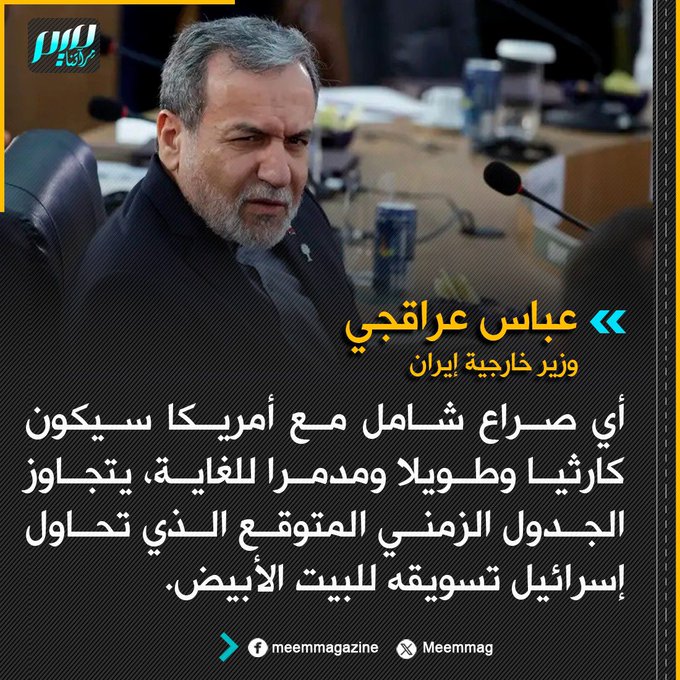 وزير خارجية إيران: أي صراع شامل مع أمريكا سيكون كارثيا وطويلا ومدمرا للغاية، يتجاوز الجدول الزمني المتوقع الذي تحاول إسرائيل تسويقه للبيت الأبيض.