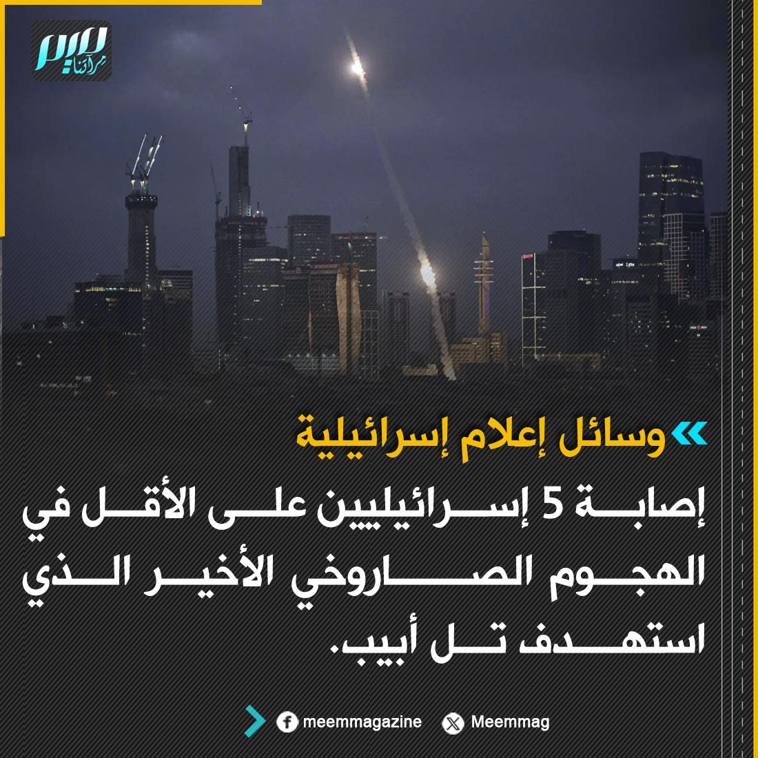 وسائل إعلام إسرائيلية: إصابة 5 إسرائيليين على الأقل في الهجوم الصاروخي الأخير الذي استهدف تل أبيب.