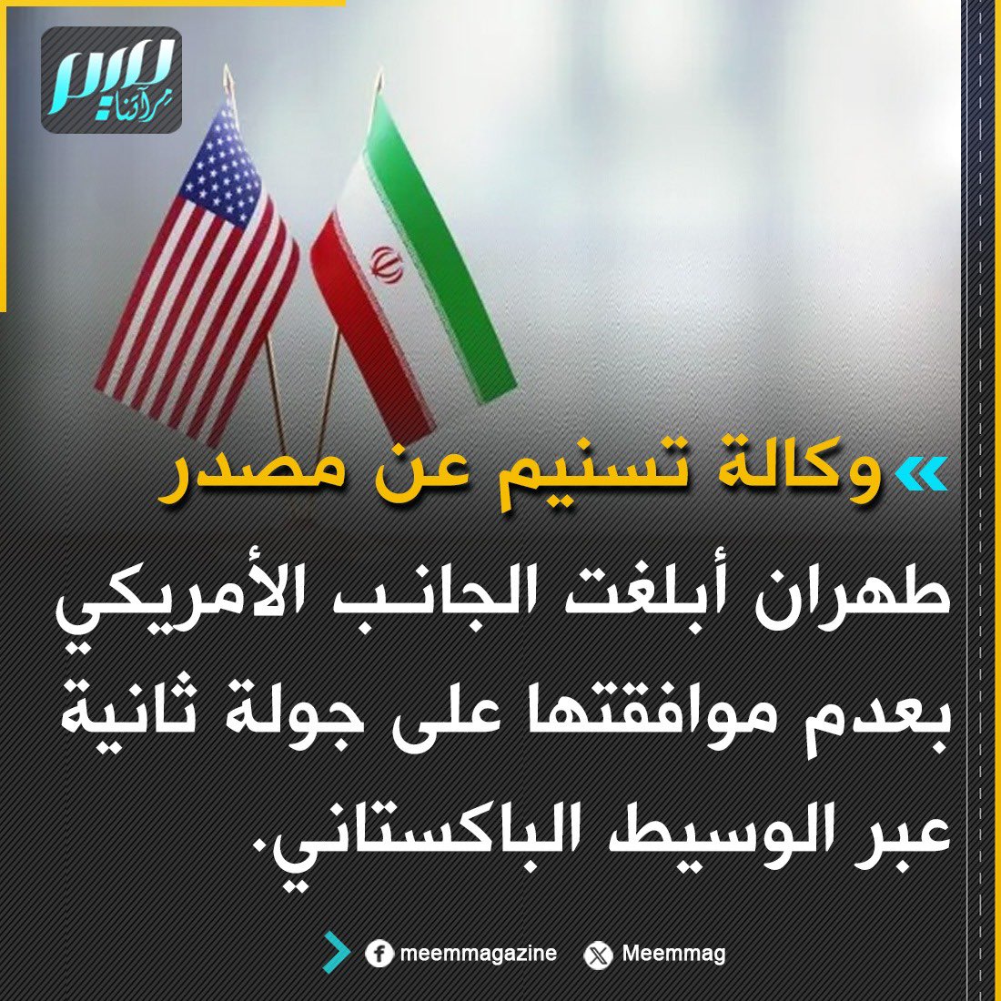 وكالة تسنيم عن مصدر: طهران أبلغت الجانب الأمريكي بعدم موافقتها على جولة ثانية عبر الوسيط الباكستاني.