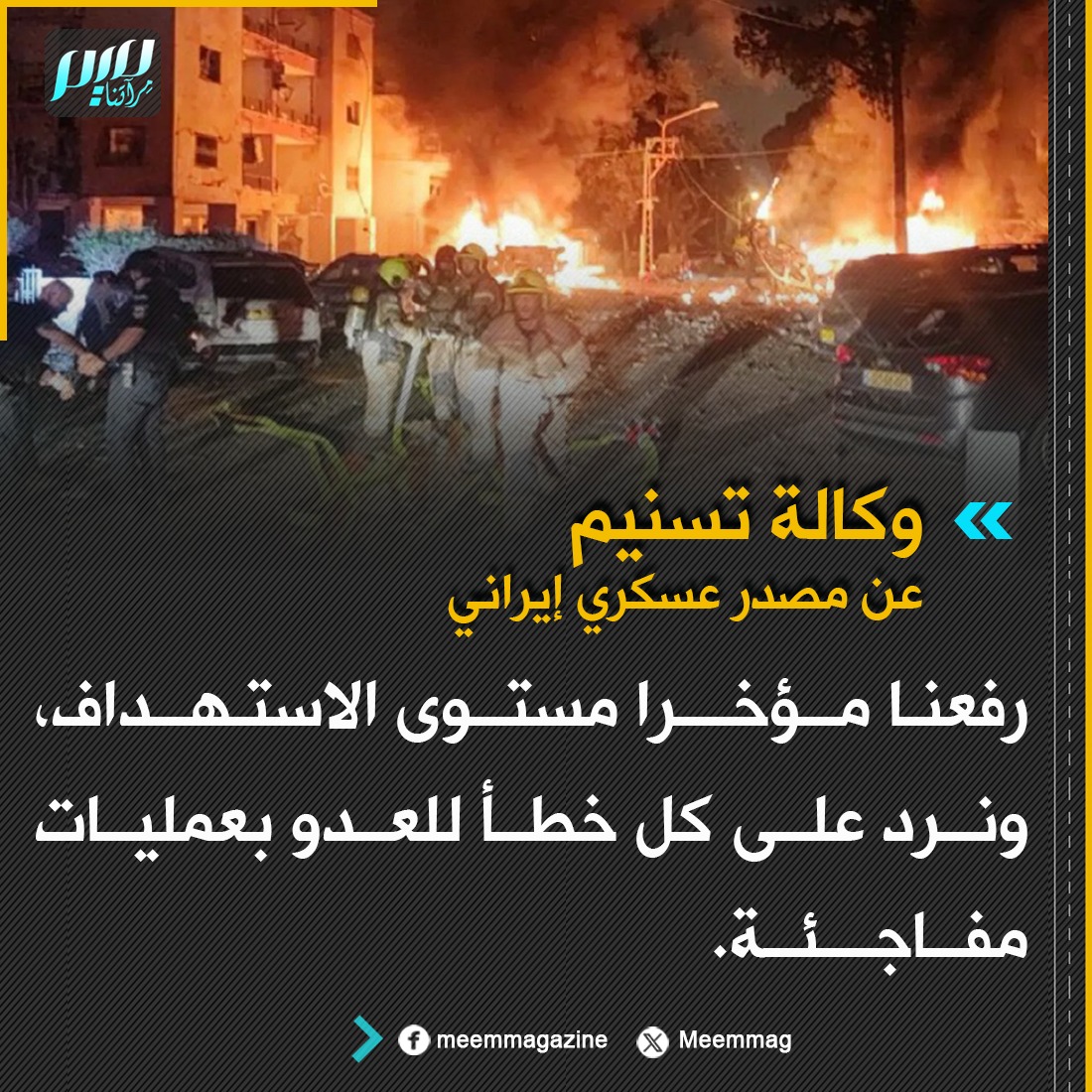 وكالة تسنيم عن مصدر عسكري إيراني: رفعنا مؤخرا مستوى الاستهداف ونرد على كل خطأ للعدو بعمليات مفاجئة.