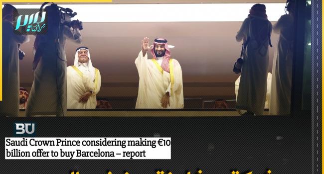 شبكة برشلونة يونيفرسال الرياضية: ولي العهد السعودي محمد بن سلمان يدرس تقديم عرض بقيمة 10 مليارات يورو لشراء نادي برشلونة.