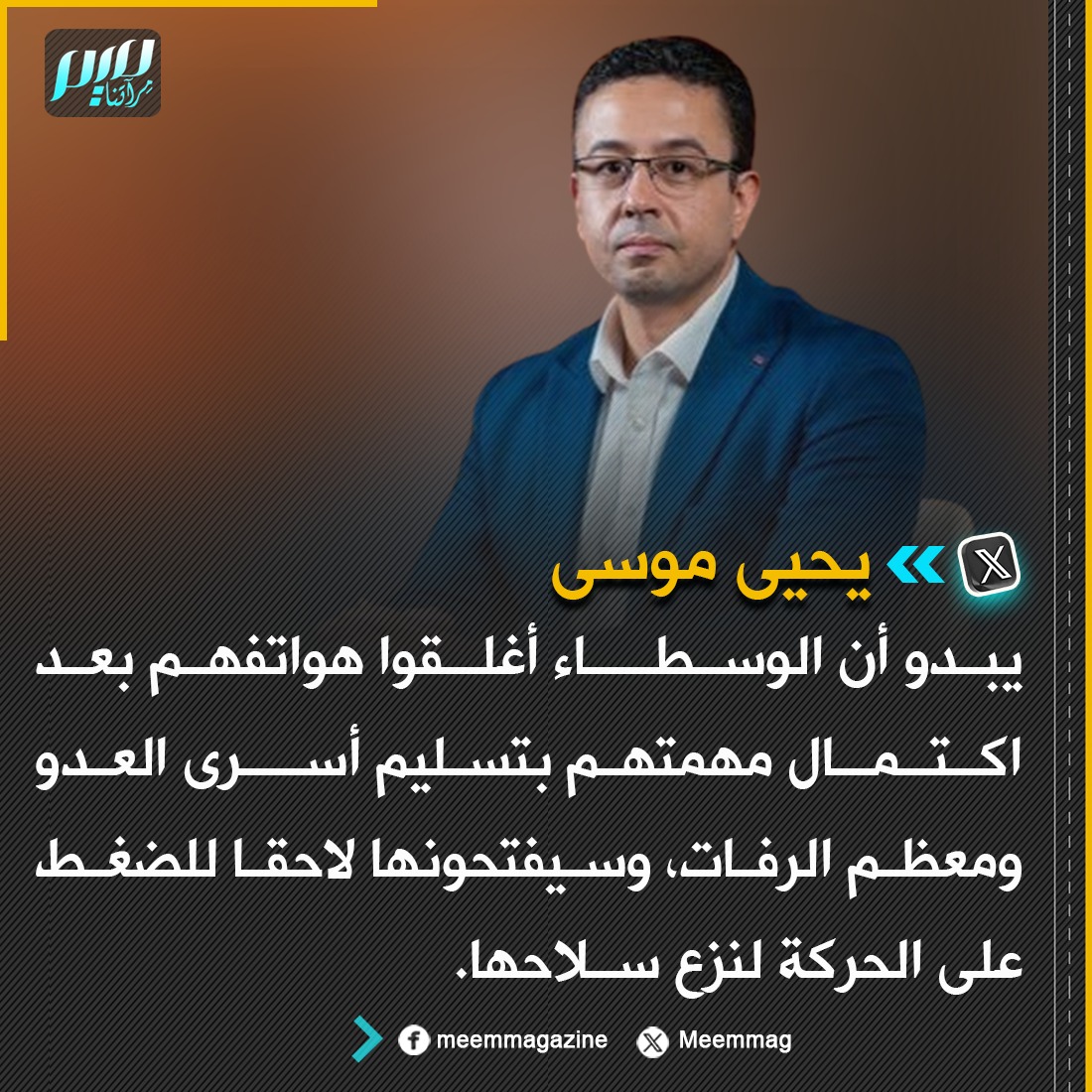 يحيى موسى: يبدو أن الوسطاء أغلقوا هواتفهم بعد اكتمال مهمتهم بتسليم أسرى العدو ومعظم الرفات، وسيفتحونها لاحقا للضغط على الحـ ـركة لنزع سـ ـلاحها.