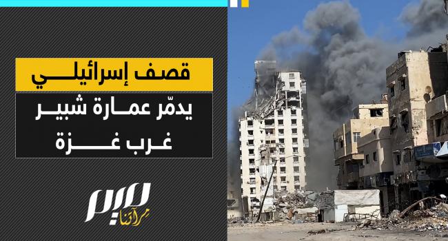 طائرات الاحتلال تشن غارة جوية على عمارة "شبير" في منطقة أبو حصيرة غرب غزة، ما أدى إلى دمار المبنى وأضرار في المنازل المجاورة.