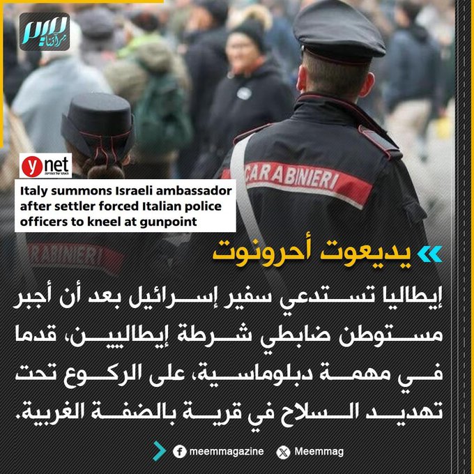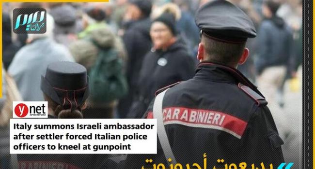 يديعوت أحرونوت: إيطاليا تستدعي سفير إسرائيل بعد أن أجبر مستوطن ضابطي شرطة إيطاليين، قدما في مهمة دبلوماسية، على الركوع تحت تهديد السلاح في قرية بالضفة الغربية.