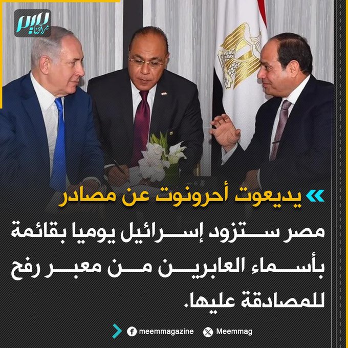 يديعوت أحرونوت عن مصادر: مصر ستزود إسرائيل يوميا بقائمة بأسماء العابرين من معبر رفح للمصادقة عليها.