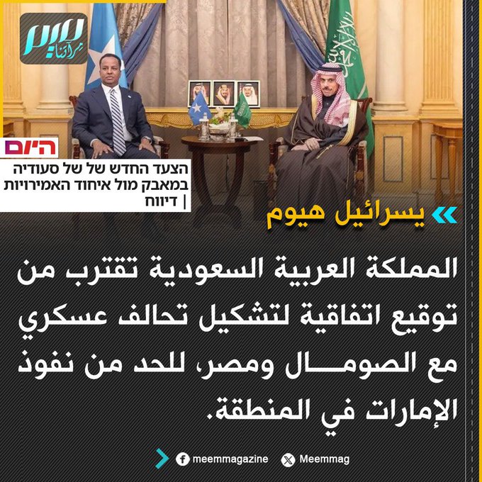 يسرائيل هيوم: المملكة العربية السعودية تقترب من توقيع اتفاقية لتشكيل تحالف عسكري مع الصومال ومصر، للحد من نفوذ الإمارات في المنطقة