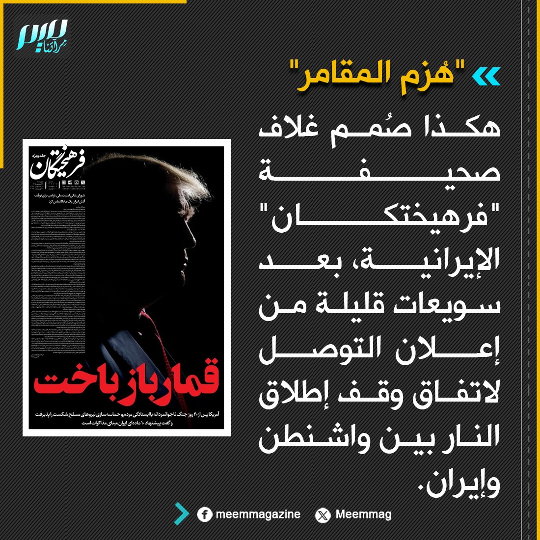 ‏"هزم المقامر".. عنوان غلاف صحيفة " فرهيختگان" الإيرانية، بعد سويعات من إعلان التوصل لاتفاق وقف إطلاق النار بين واشنطن وطهران.