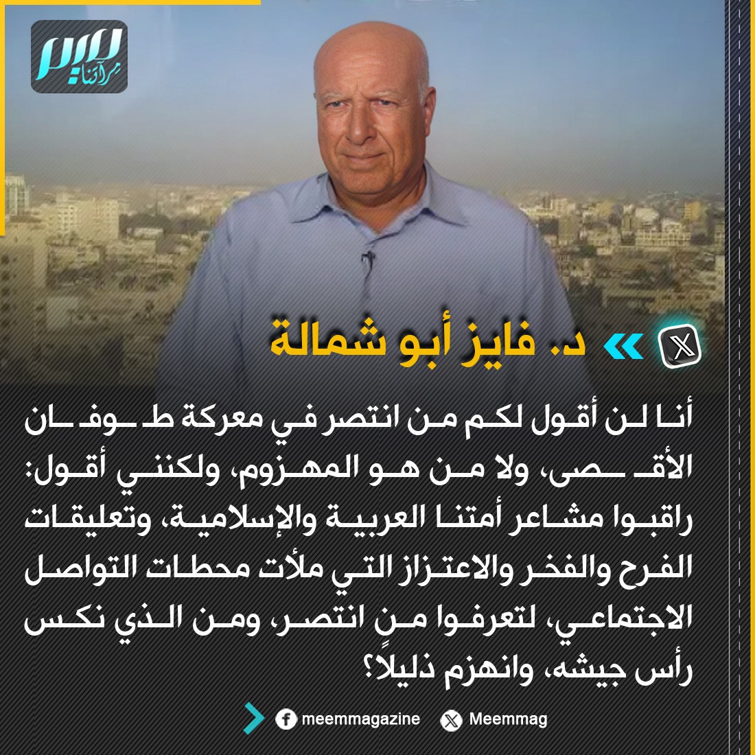 أبو شمالة: أنا لن أقول لكم من انتصر في معركة طـ ـوفـ ـان الأقـ ـصى، ولا من هو المهزوم، ولكنني أقول: راقبوا مشاعر أمتنا العربية والإسلامية، وتعليقات الفرح والفخر والاعتزاز التي ملأت محطات التواصل الاجتماعي، لتعرفوا من انتصر، ومن الذي نكس رأس جيشه، وانهزم ذليلاً؟