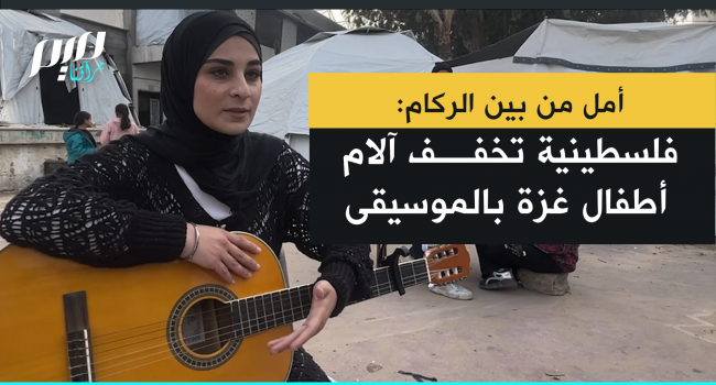أملٌ من بين الركام… الفلسطينية رولا دلول (32 عامًا) من مدينة غزة، تُعلم الأطفال العزف والغناء، سعيًا لنشر البهجة والتخفيف من الآثار النفسية للحرب.