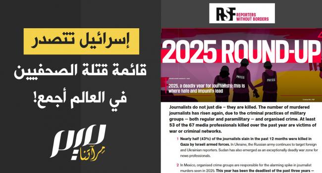 إسرائيل في صدارة الدول التي تستهدف الصحفيين قتلا واعتقالا، وفق ما ورد في التقرير السنوي لـ"مراسلون بلا حدود"؛ تقرير فضح منظومة القمع الممنهجة لدى الاحتلال، التي تغتال الحقيقة في مهدها.
