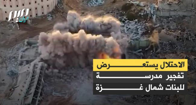 مشاهد توثق تفجـ.ـير الاحـ.ـتلال لمدرسة الكويت الثانوية للبنات في بيت لاهيا شمال قطاع غزة، مواصلا حملته المسعورة لتجهيل وتهجـ.ـير الفلسطينيين.