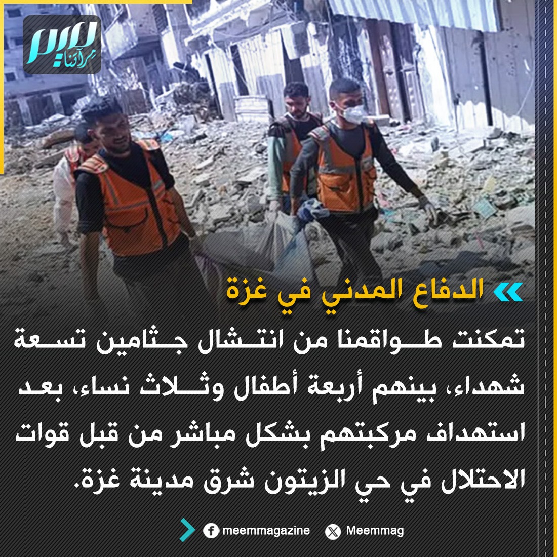 الدفاع المدني في غزة: تمكنت طواقمنا من انتشال جثـ ـامين تسعة شـ ـهداء